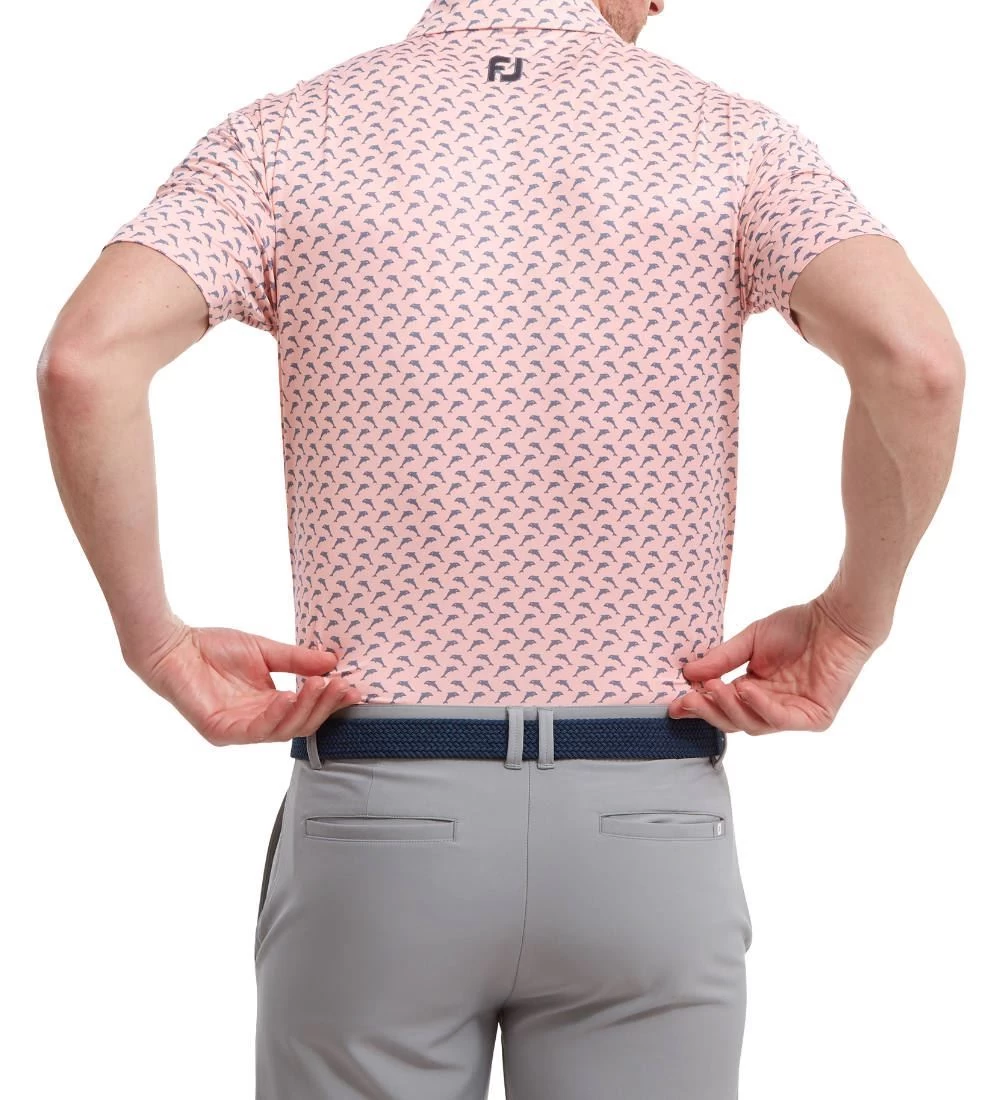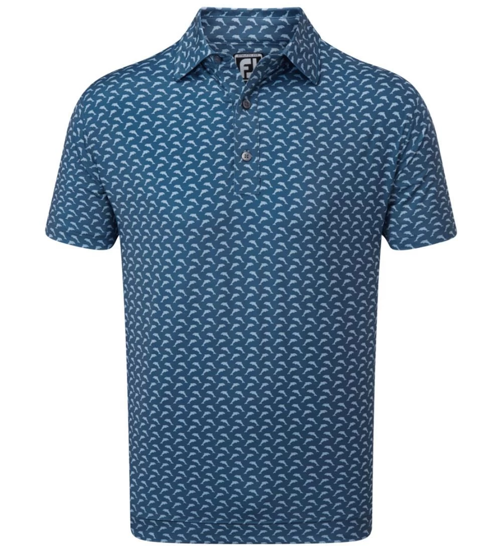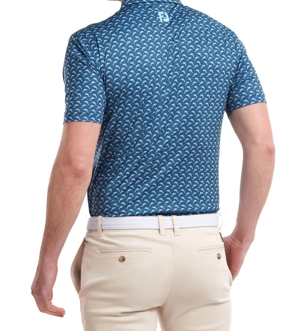 FJ ProDry Lightweight Stretch Lisle fabric. All over dolphin print pattern. Colour-coordinate rear yoke FJ logo. Moisture-wicking technology draws moisture away from the body. Easy care fabric to minimise wrinkling. SPF 30 UV protection