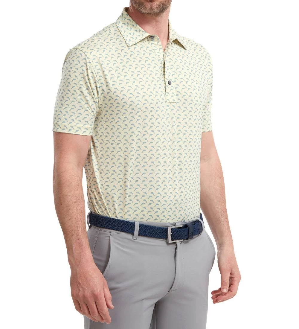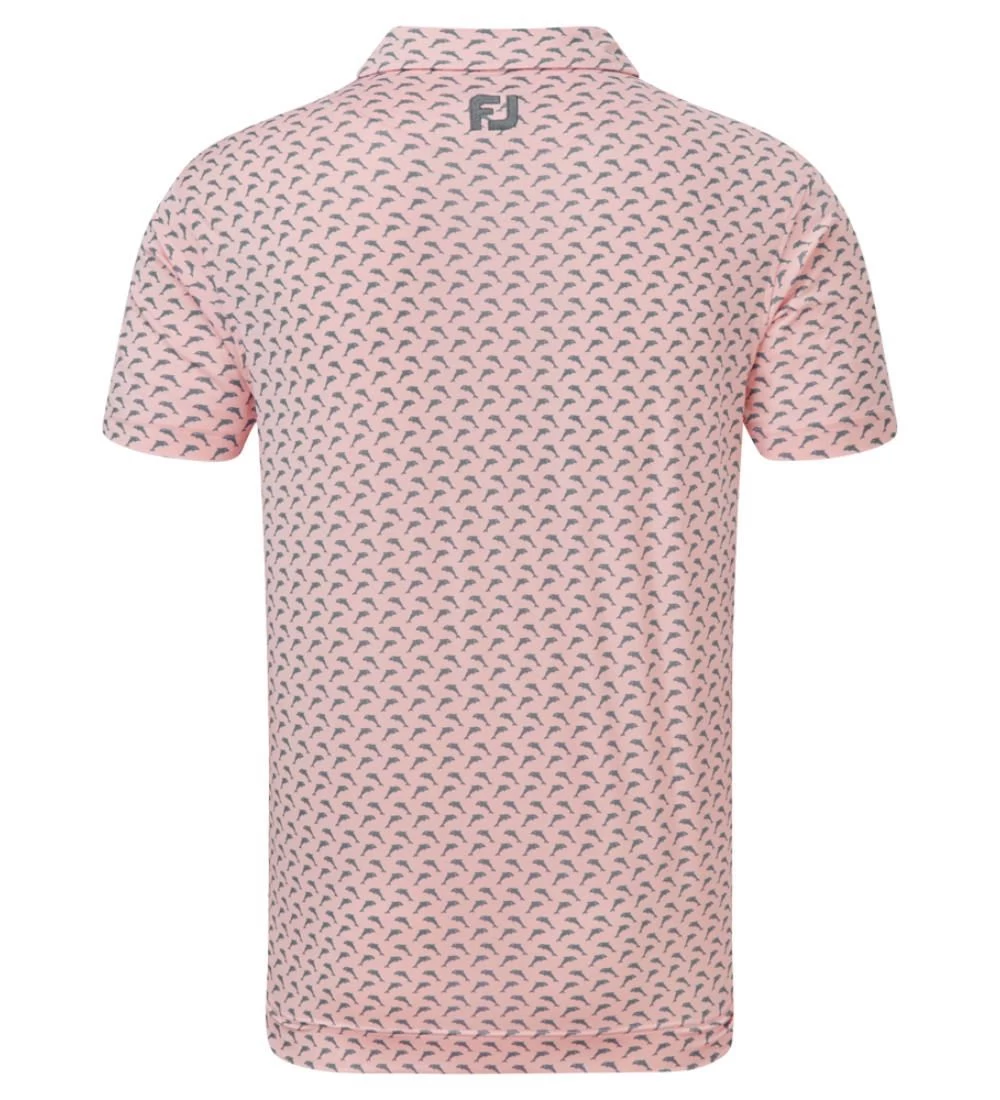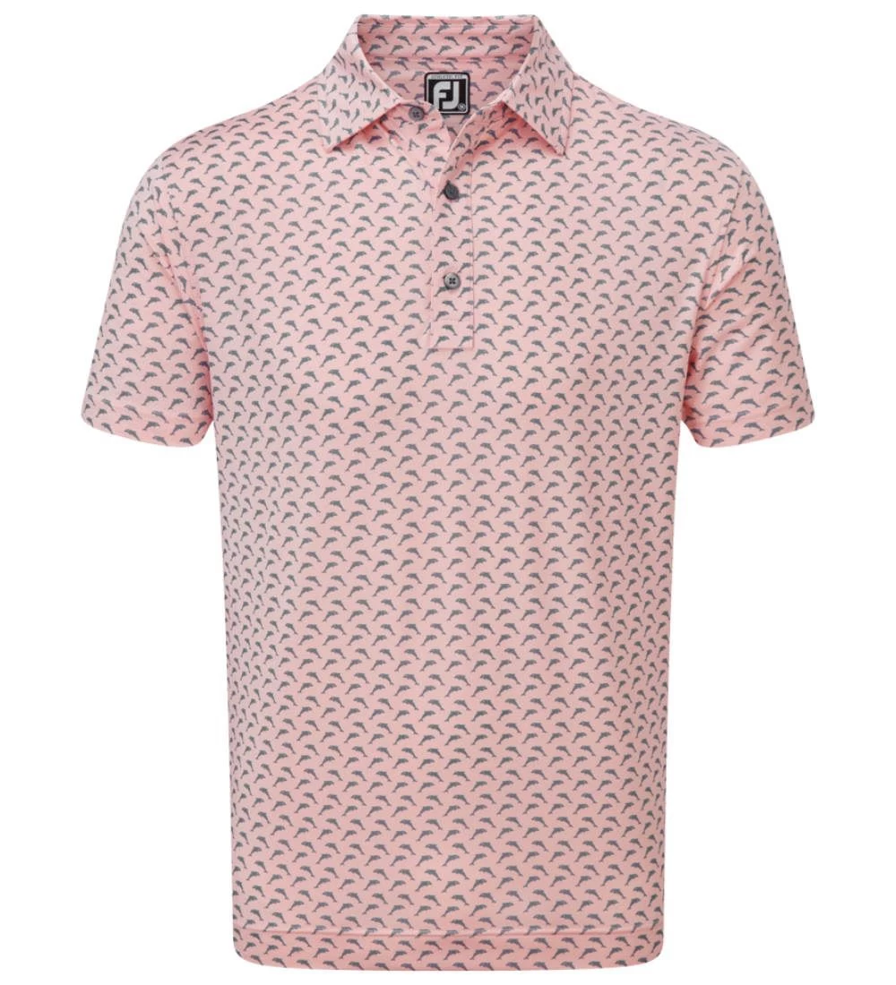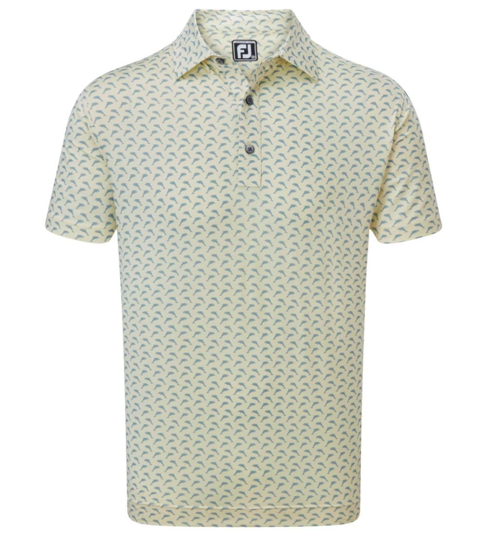 FJ ProDry Lightweight Stretch Lisle fabric. All over dolphin print pattern. Colour-coordinate rear yoke FJ logo. Moisture-wicking technology draws moisture away from the body. Easy care fabric to minimise wrinkling. SPF 30 UV protection