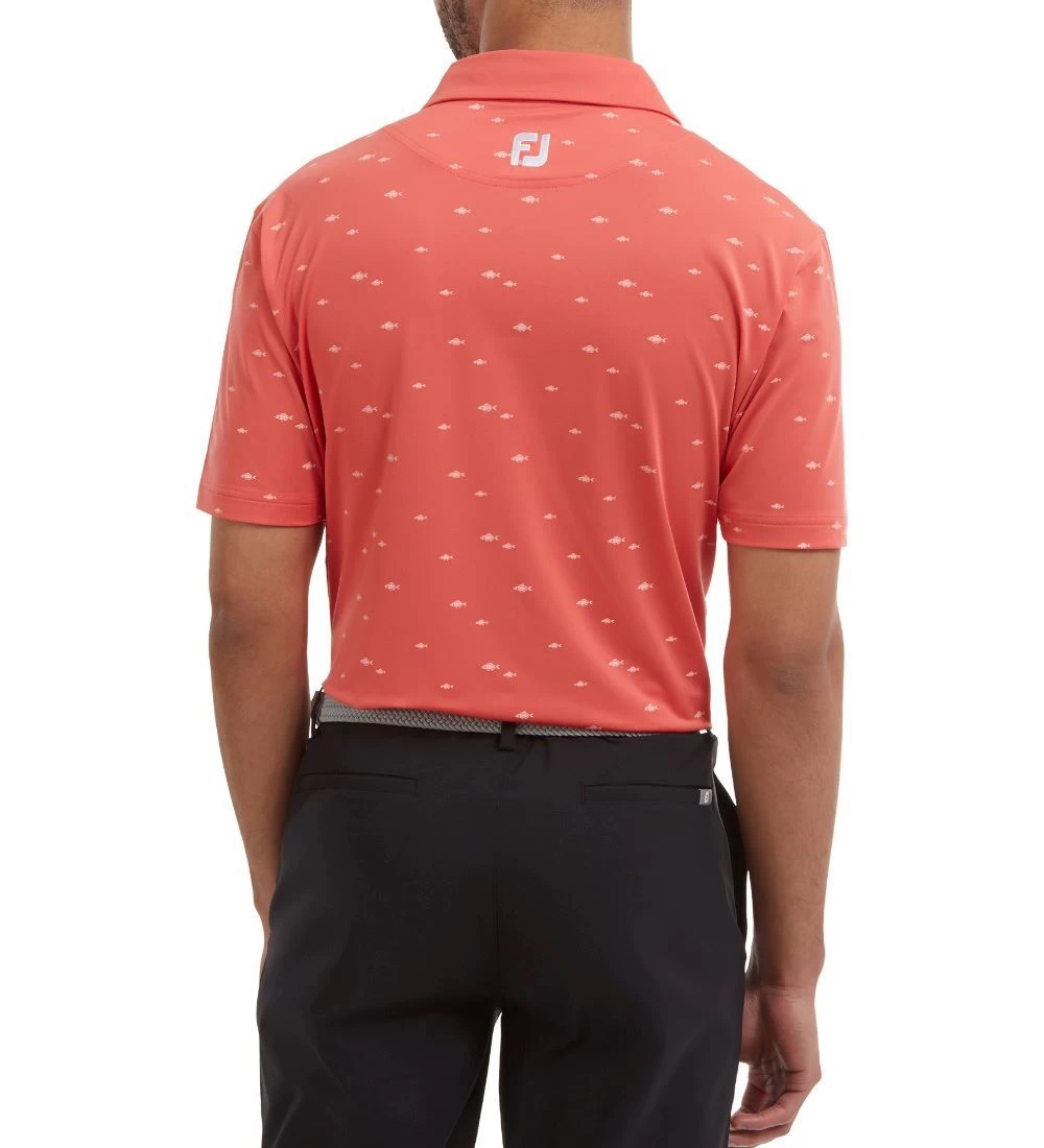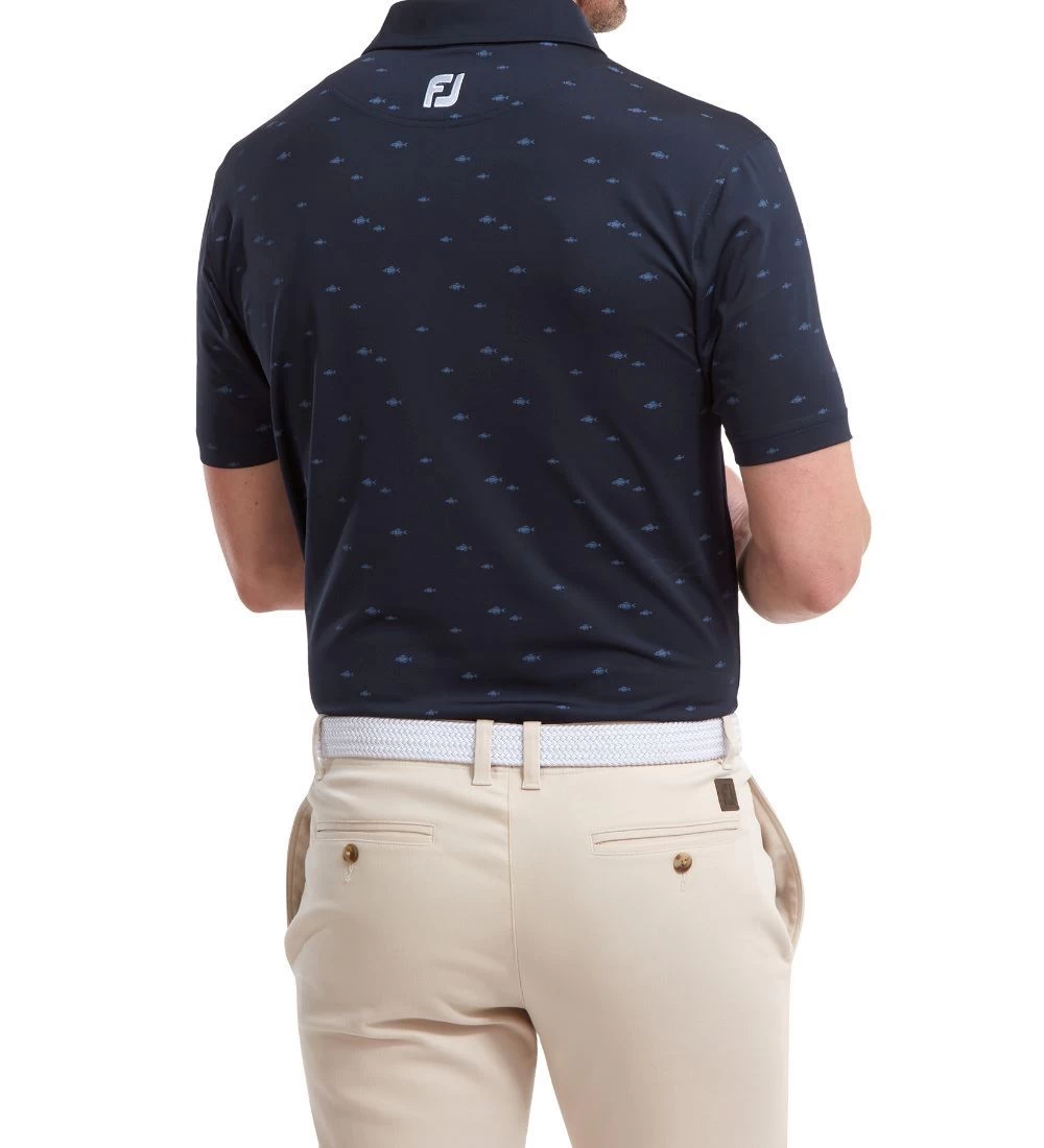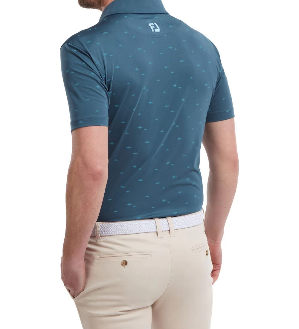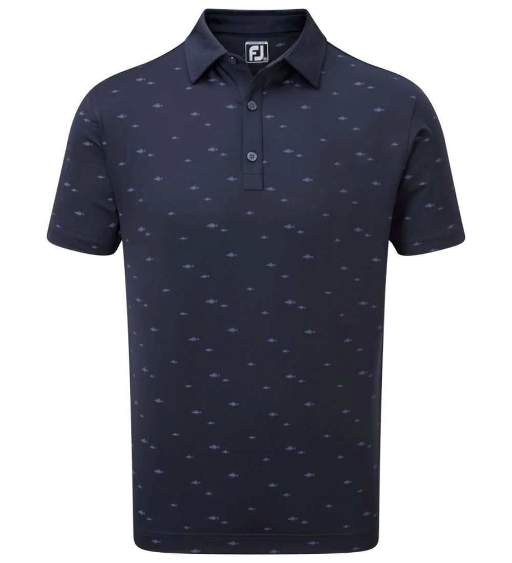 FJ ProDry Lightweight Stretch Lisle fabric. All over tonal fish print pattern. Contrast rear yoke FJ logo. Moisture wicking technology draws moisture away from the body. Easy care fabric to minimise wrinkling. SPF 30 UV protection